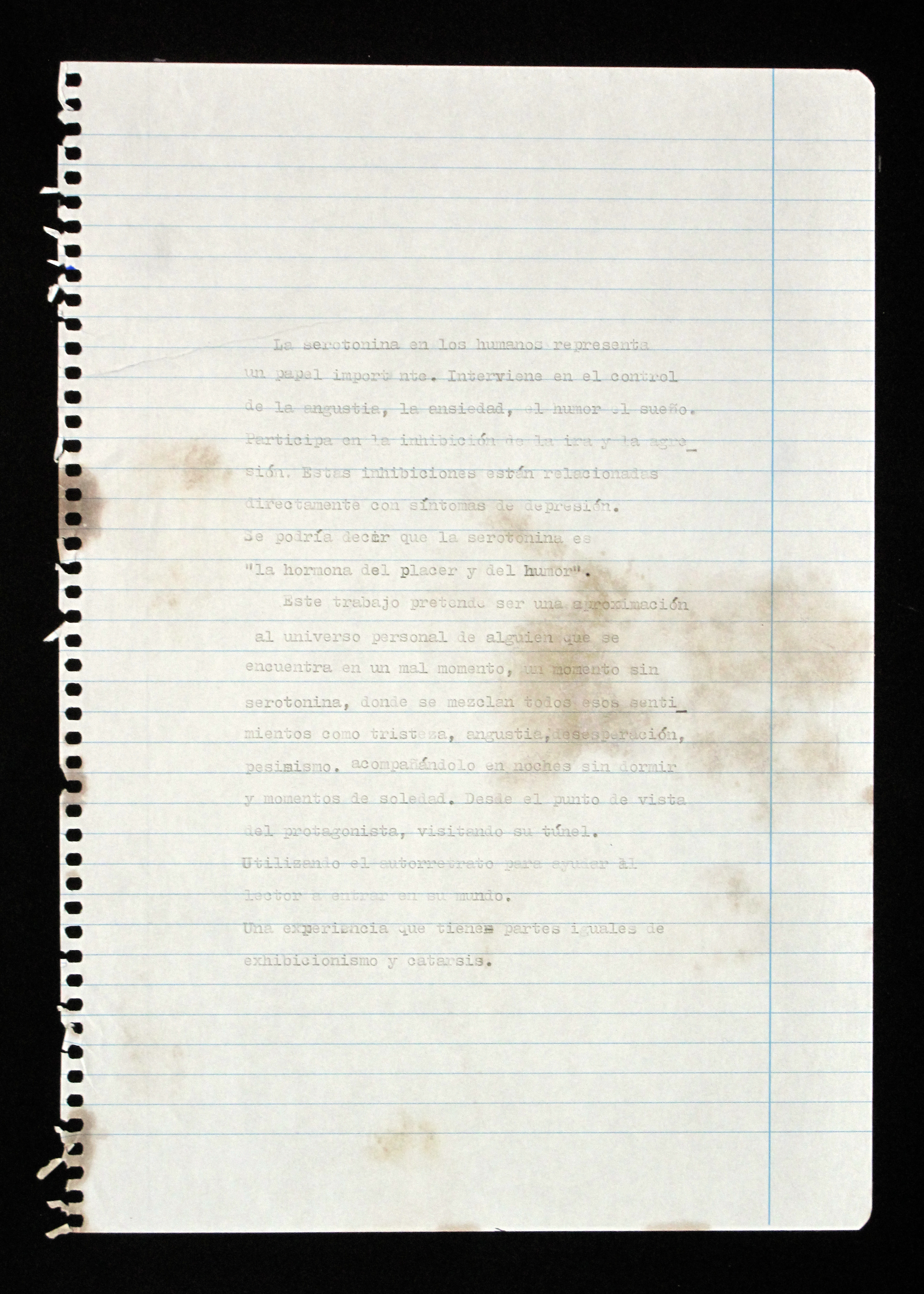 Este trabajo pretende ser una aproximación al universo personal de alguien que se encuentra en un mal momento; un momento sin serotonina, donde se mezclan todos esos sentimientos como tristeza, angustia, desesperación, pesimismo, acompañándolo en noches sin dormir y momentos de soledad. Desde el punto de vista del protagonista, visitando su túnel. Utilizando el autorretrato como medio, el lector se adentra en su mundo.